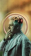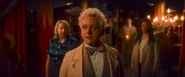 Aziraphale manages to transport his disincorporated self from heaven back to Earth where he finds a drunk Crowley grieving his "death". He is incredibly saddened to hear that his bookshop was destroyed but Crowley reveals he saved Agnes Nutter's book which has Aziraphale's notes on Adam Young. Aziraphale leaves to find a body to host him, landing in Madame Tracy during one of her seances.