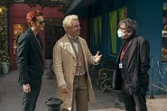 As soon as they disappear, Aziraphale watches as Crowley collapses in pain due to Satan himself rising up and being incredibly angry. Aziraphale tries to motivate Crowley not to give up threatening to never speak to him again if he doesn't do something. Crowley stops time, transporting himself, Aziraphale and Adam to a desert where the angel and demon's wings are visible and they have their personal tools, Aziraphale's Flaming Sword and Crowley's hand crank. The two tell Adam about his real father and that Adam will need to do something before restarting time and they watch as Adam faces Satan, stating that he is not his real father and never had been, causing the Devil to vanish.