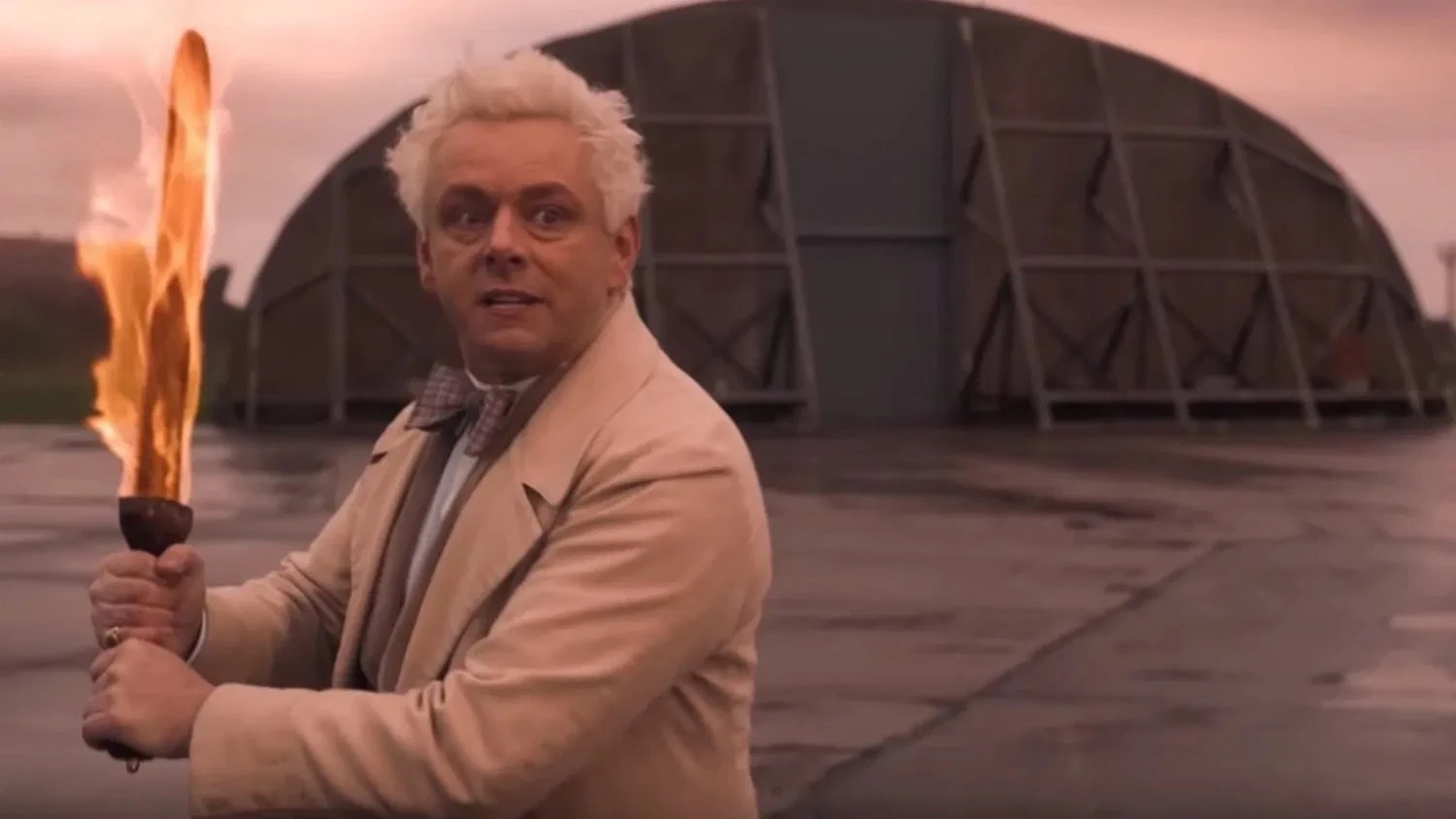 Inside the airfield, they, along with Anathema and Newton, arrive to stop the end of the world. Aziraphale takes Shadwell's weapon to kill Adam but Madame Tracy intervenes, preventing him from succeeding. Adam separates the two by giving Aziraphale a body that looks exactly like his old one. Aziraphale and the others witness the Them defeat the Four Horsemen with Aziraphale's flaming sword - with the exception of Death - and Crowley returns The Nice and Accurate Prophecies of Agnes Nutter, Witch to Anathema. A piece of burned paper flies from the book which Aziraphale grabs. The prophecy states that they will face fire and need to choose their faces wisely.